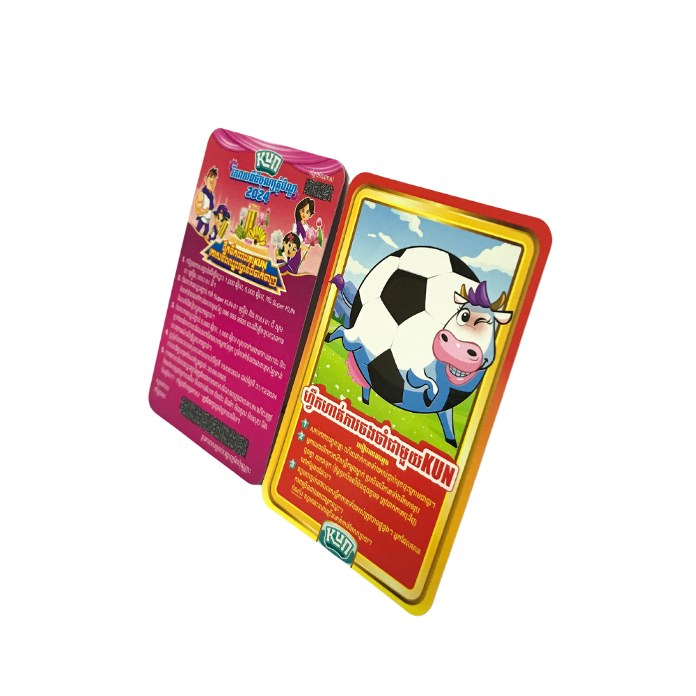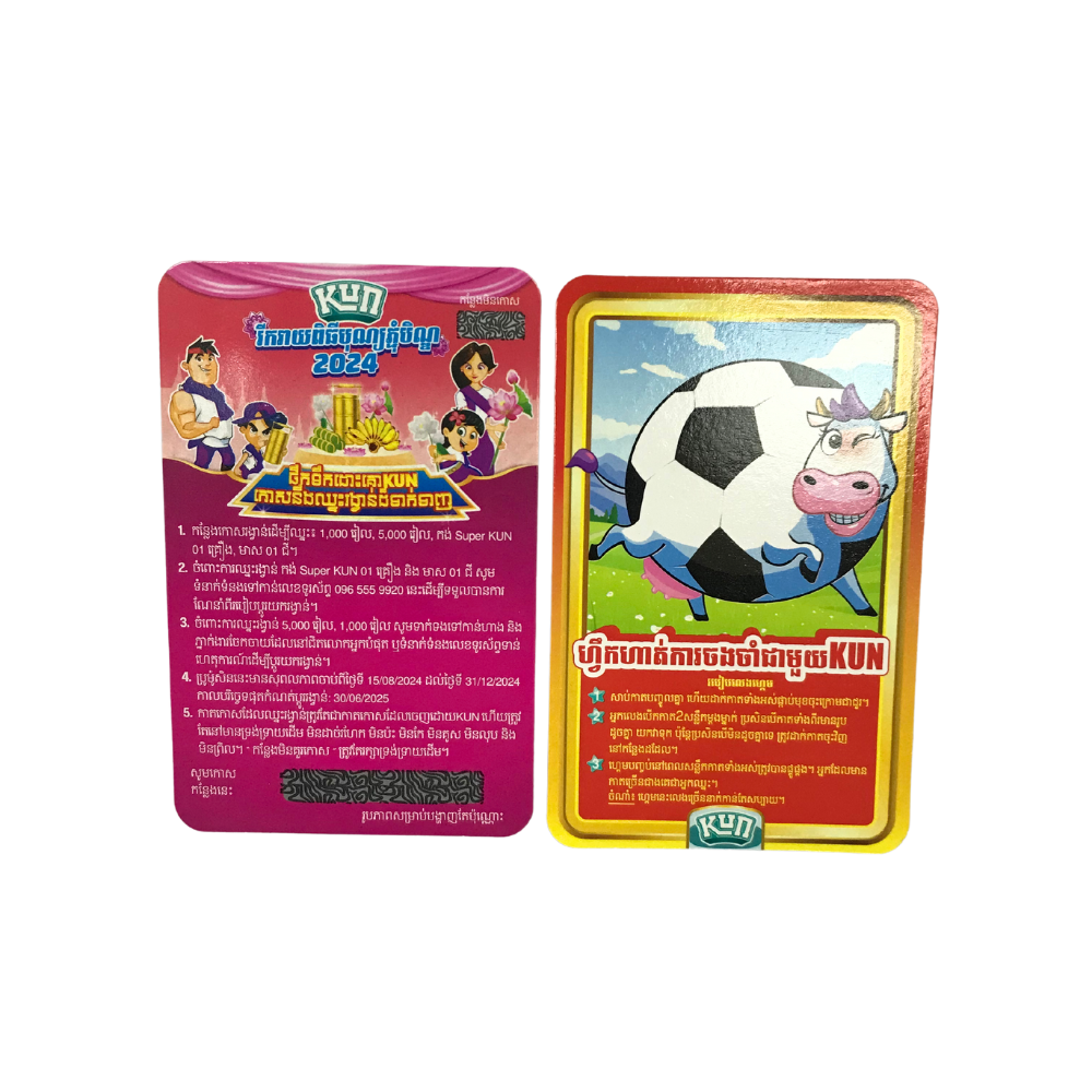 – In offset 4 màu, cán màng bóng, phủ nhũ cào hoa văn, bế bo góc thành phẩm